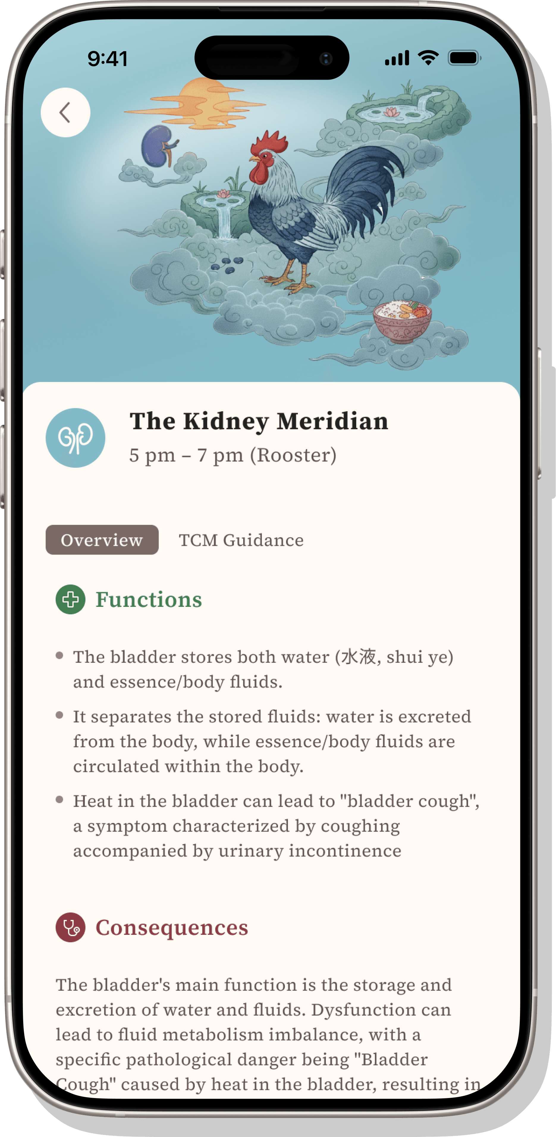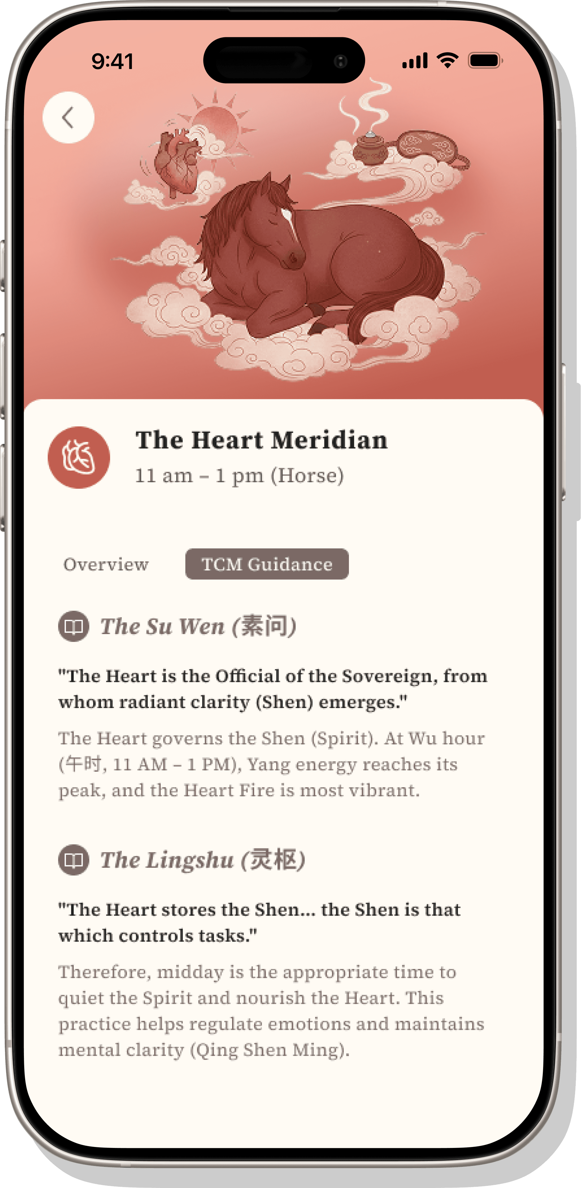 Users can explore structured, easy-to-understand explanations tied to each time period within the TCM body clock. For every hour block, the app provides related organs, functions, symptoms to watch for, and recommended lifestyle habits.