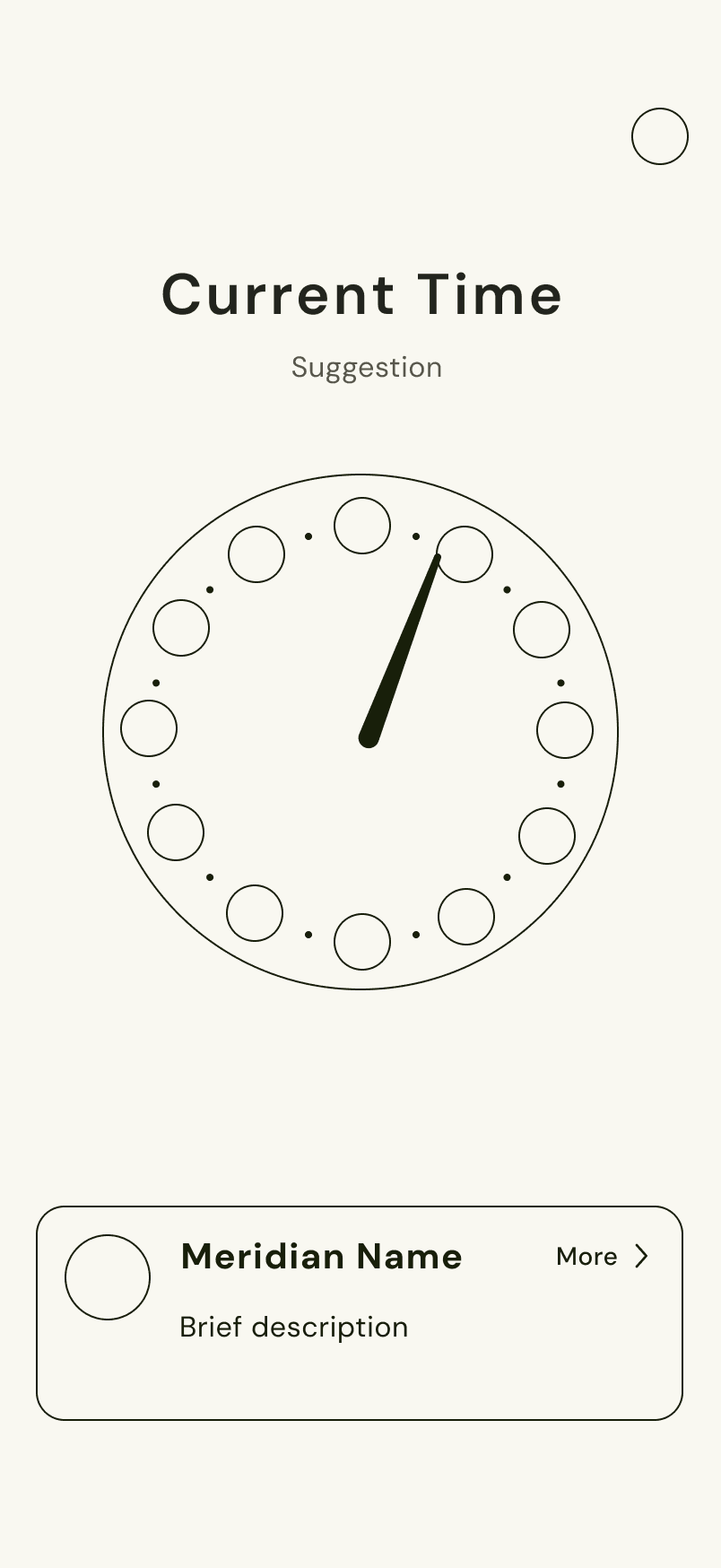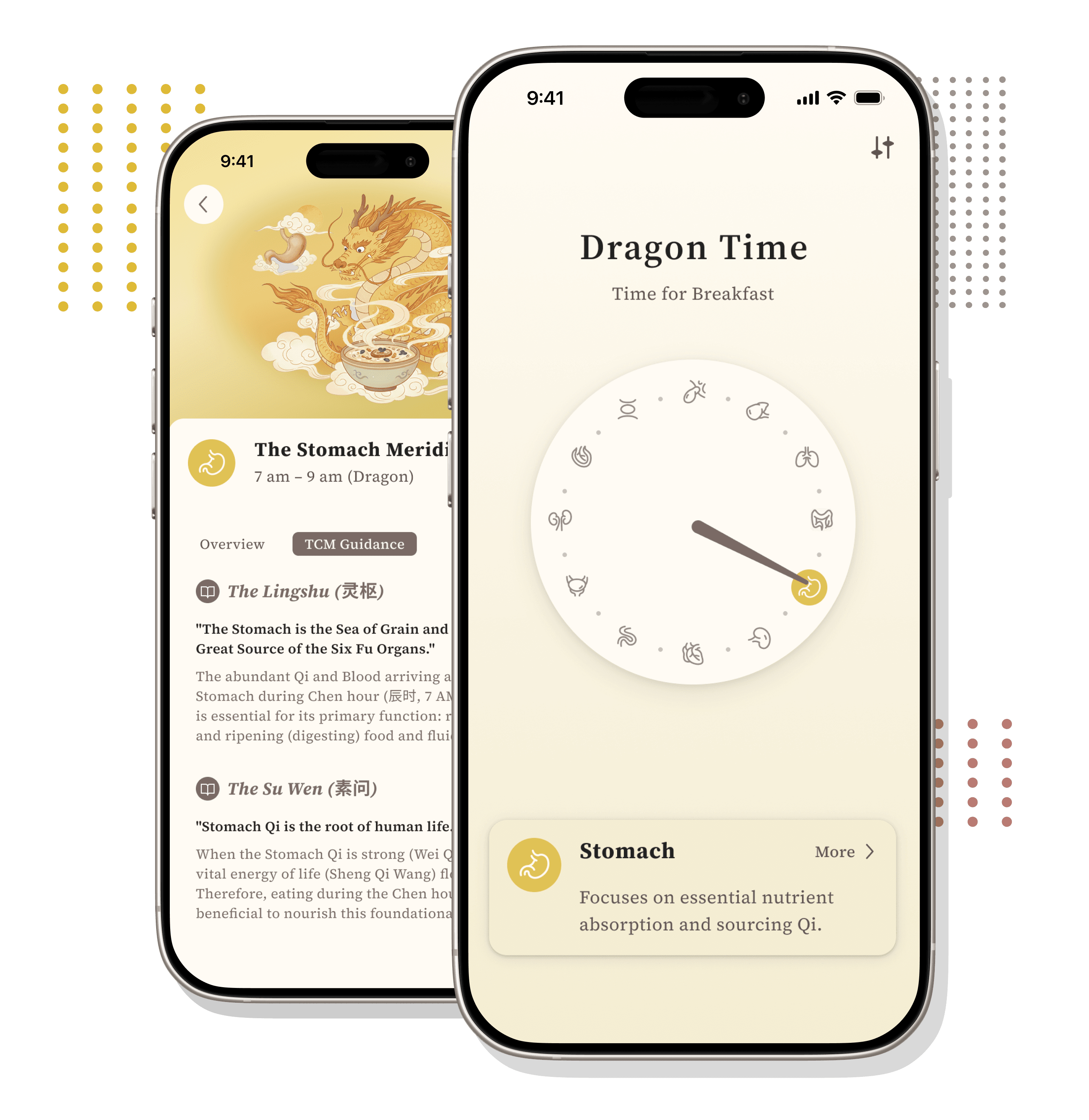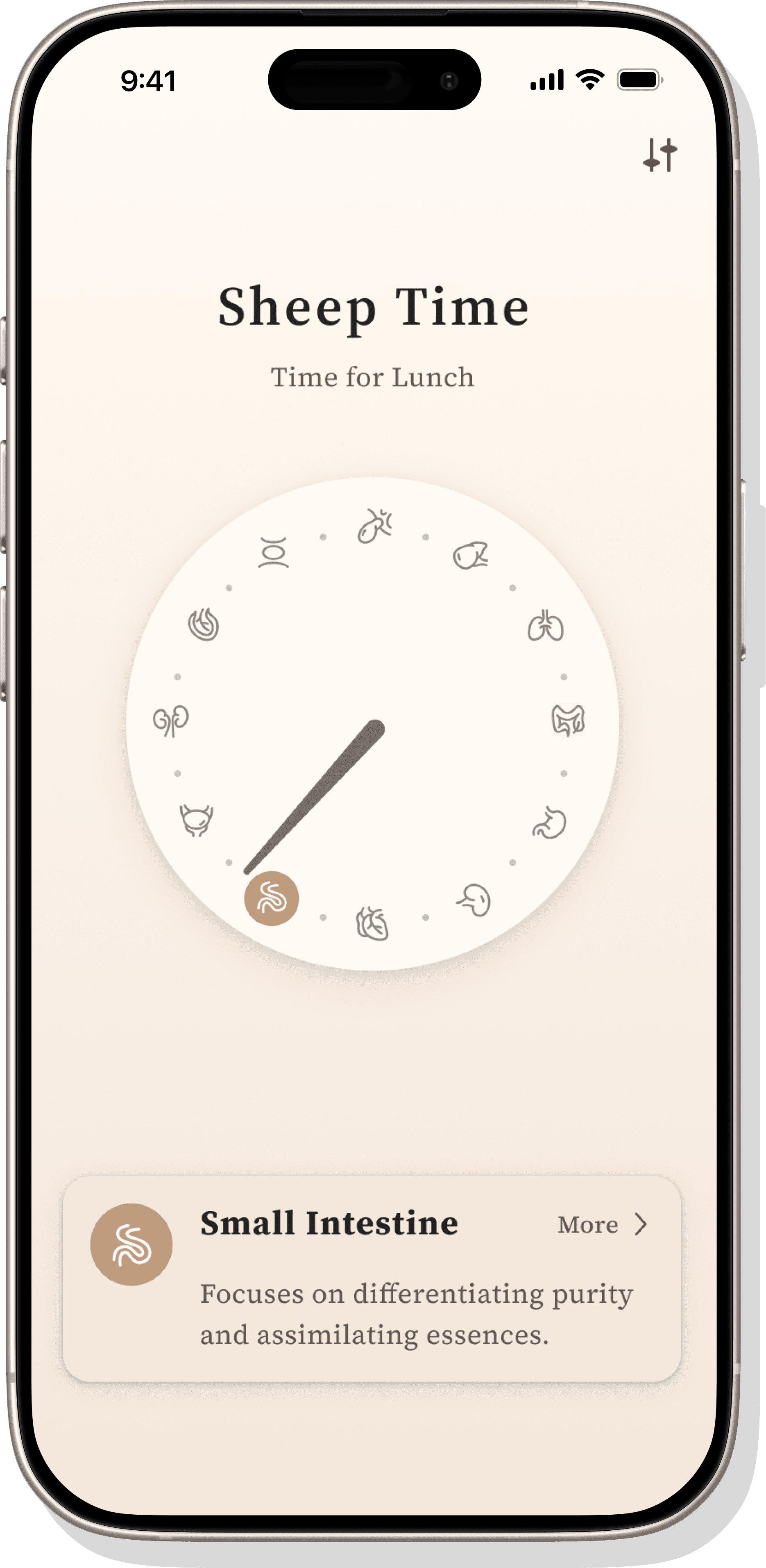 A clean, focused home screen that displays the current time, the active TCM meridian, and tailored health tips based on the hour.
